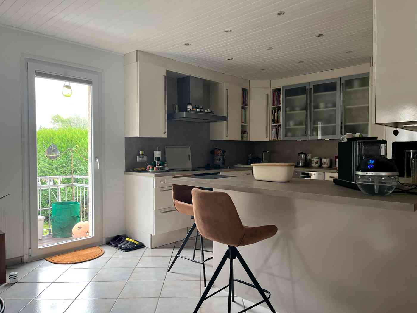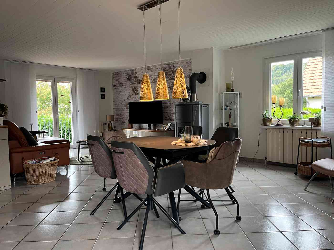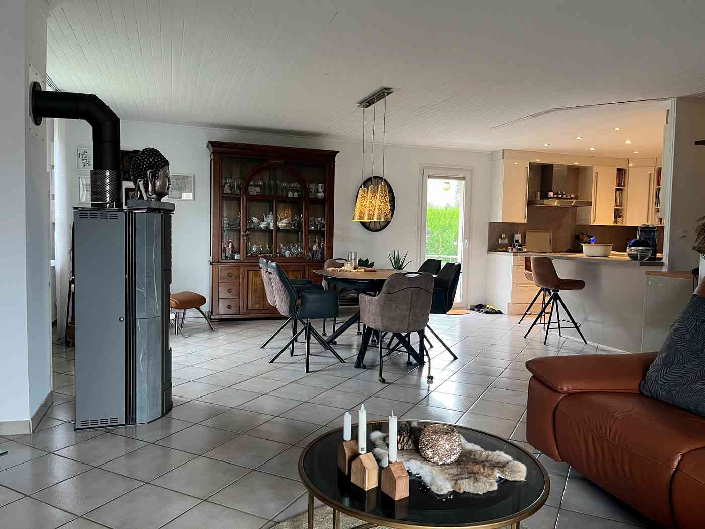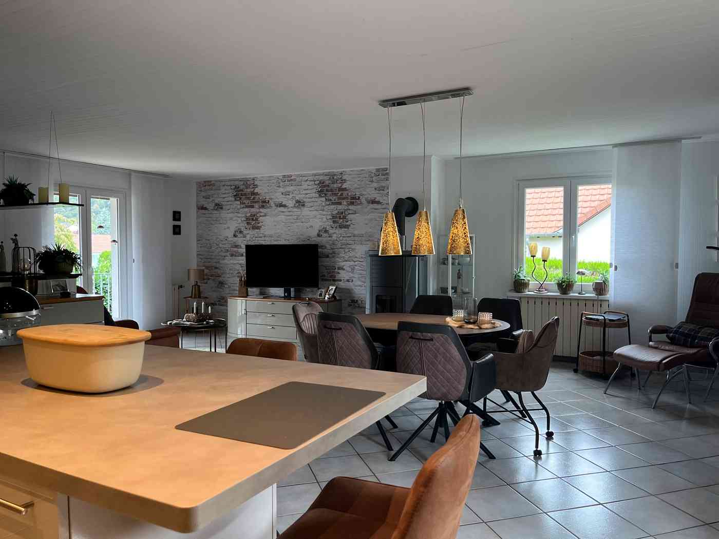Nach dem Betreten des Hauses gelangen Sie über eine Treppe eine halbe Etage nach oben und befinden sich direkt im großzügigen, lichtdurchfluteten Wohnbereich. Eine offen gestaltete Küche schafft eine einladende Atmosphäre – perfekt für gemeinsame Kochabende. Ein Pellet-Ofen sorgt in den kalten Monaten für eine gemütliche und wohlige Wärme.