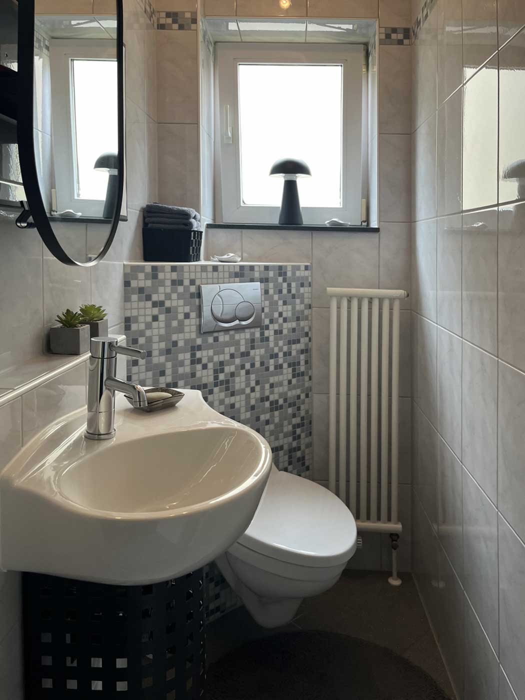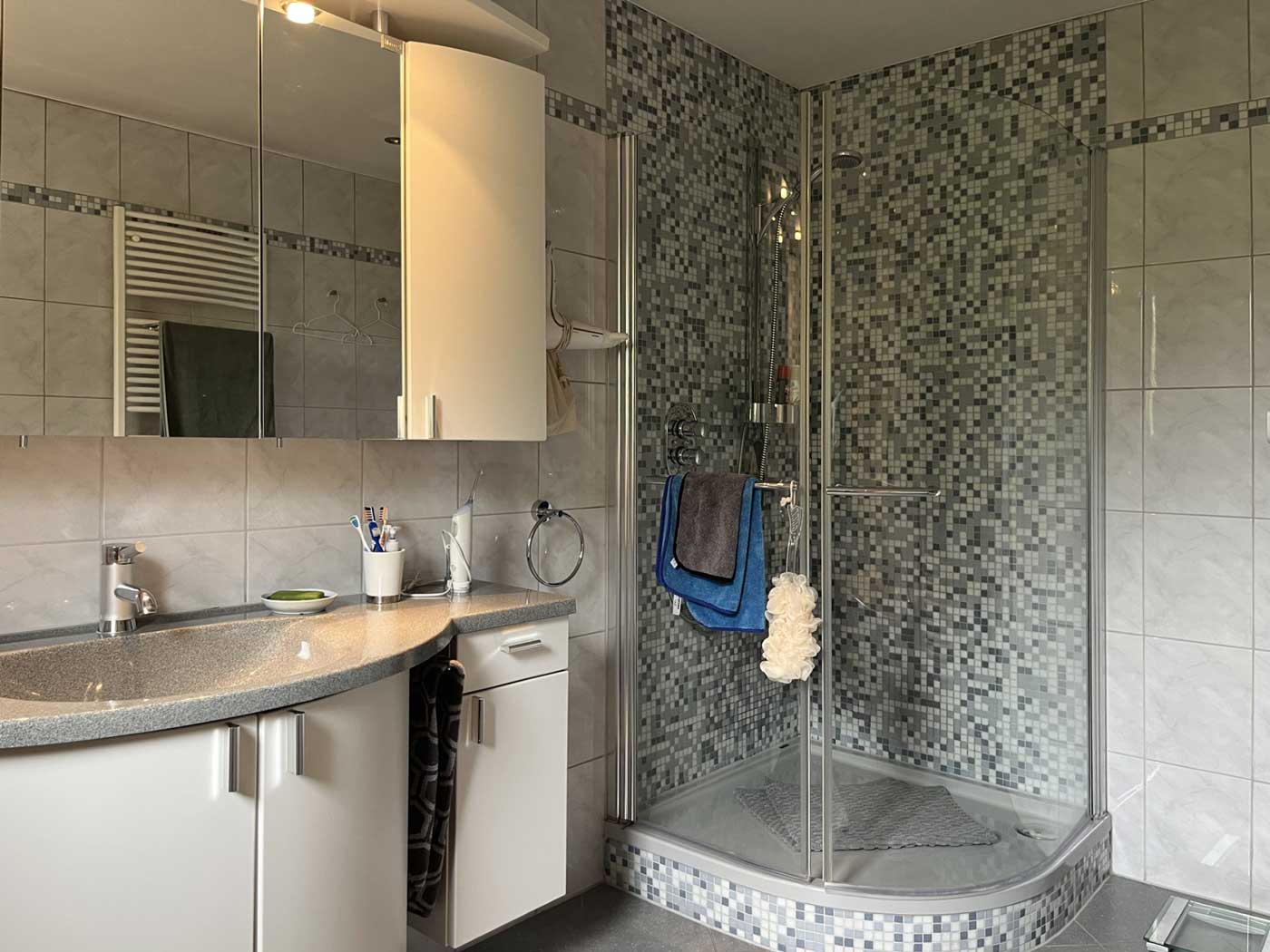 Über den angrenzenden Flur erreichen Sie zwei gut geschnittene Schlafzimmer, ein Gäste-WC sowie das Tageslichtbad mit Dusche und Badewanne.